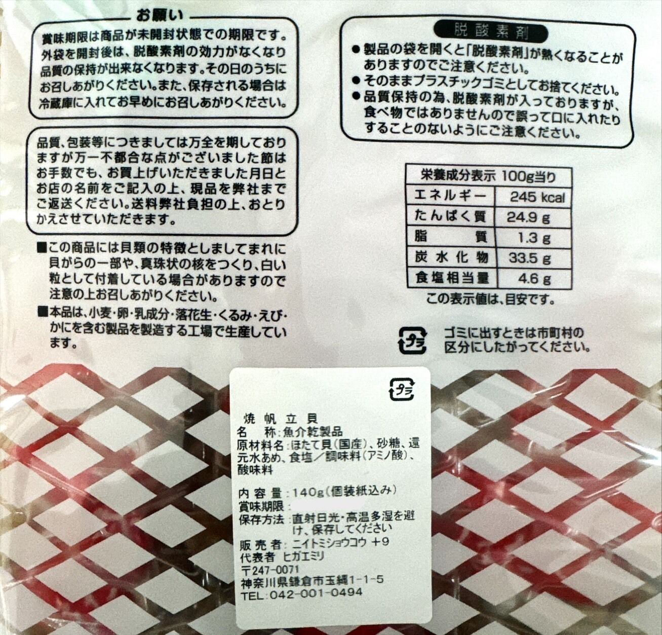 ほたて貝(国産)、砂糖、還元水あめ、食塩/調味料(アミノ酸)、酸味料