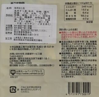 魚肉すり身(魚肉、砂糖)(国内製造)、ごま、水飴、でん粉、砂糖、食塩、ゼラチン、植物性たん白、醸造酢、植物油脂、醤油、観点、/ソルビトール、賞味了(アミノ酸等)、(一部に小麦・大豆・ゼラチン・ごまを含む)