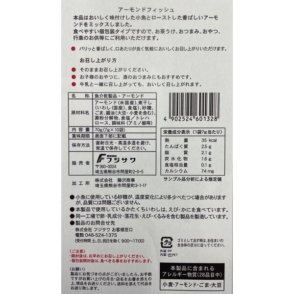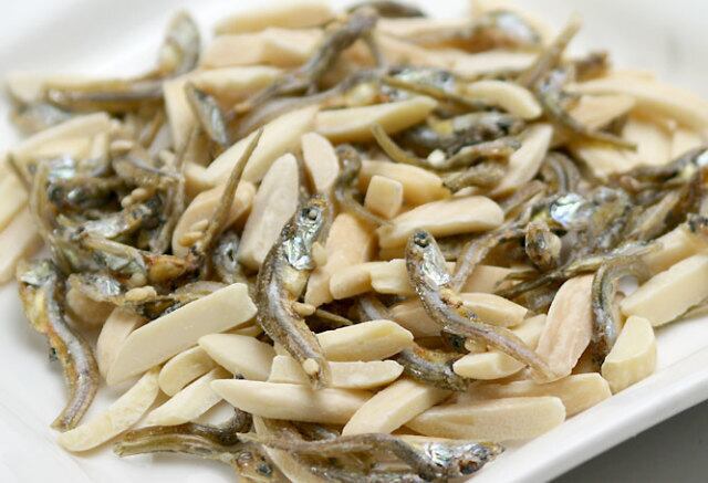 アーモンド(米国産)、煮干し(いわし(国産、食塩)、砂糖、ごま、周瑜(大豆・小麦を含む)澱粉分解物、食塩/トレハロース、調味料(アミノ酸等)